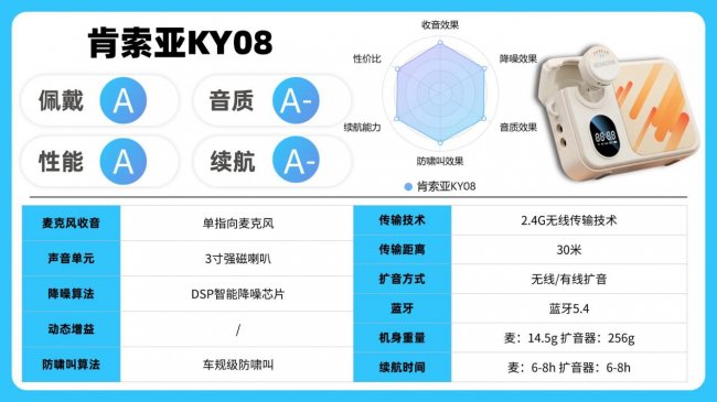 为了死磕声音清晰洪亮与零啸叫的稳定体验,西圣Bee小蜜蜂扩音器果断砍掉了所有累赘功能与噱头配置,只为专注做好扩音这件事。一款产品坚持打磨8年,累计完成20余次迭代优化,针对真实使用场景精细化改进了100多个声学与体验细节,只为带来真正专业级的扩音体验。在配置上,西圣Bee小蜜蜂扩音器同样表现丰富而强大。支持Type-C快充,搭配大容量电池可实现8小时持久续航,轻松应对一整天的课堂或演讲,同时还具备TF卡/U盘即插即播、一键录音、多模式切换等实用功能,让扩音更高效便捷。凭借这些满配配置与硬核体验,西圣Bee被公认为扩音器品类中的旗舰级天花板。02:肯 索 亚KY08无线领夹扩音器综合指数:❤❤❤❤一句话推荐:30米远距离使用也不会断连卡顿,无线有线扩音自由切换