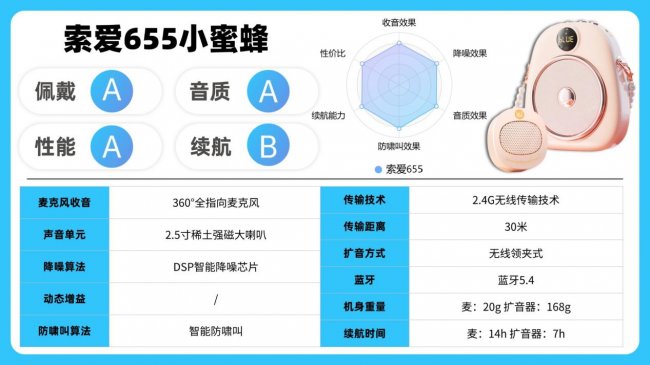 漫步者MF3的综合体验偏向细腻耐用,细节处贴合长期高频使用者的习惯,麦和主机的重量配比十分合理。9.9g单指向麦轻量稳固,夹戴牢固不易掉落,收音精准不发散,长时间佩戴无异物感。200g 主机方便随身携带,适合经常跨场地工作的人群。76mm钕铁硼喇叭音质温润,人声还原真实,没有过度修饰,听感自然舒适。智能降噪和防啸叫经过优化,应对教室、商场、户外等场景都有不错表现,2.4G无线传输抗干扰性强,20米内稳定传输声音。010:索 爱 655无线领夹扩音器综合指数:❤❤❤❤一句话推荐:。20克的重量佩戴轻便,不会给用户带来颈部负担