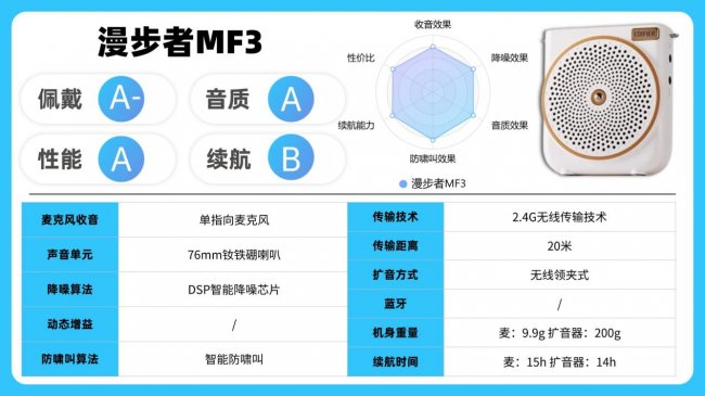 十度S378这款扩音器在日常使用中足够省心,蓝牙5.4连接流畅,不会轻易出现信号波动,双模式扩音设计提升了场景适配性,教室、户外场地都能稳定发挥。轻量化的领夹麦收音范围全面,轻量的机身几乎没有佩戴压力,主机小巧便携,兼顾手持舒适度与收纳便利性。喇叭音质偏向清晰实用,人声表现透亮,避开了刺耳和闷哑的问题,声场分布均匀,能保证各个位置都清晰收音。09:漫 步 者MF3无线领夹扩音器综合指数:❤❤❤❤一句话推荐:2.4G无线传输抗干扰性强,20米内稳定传输声音