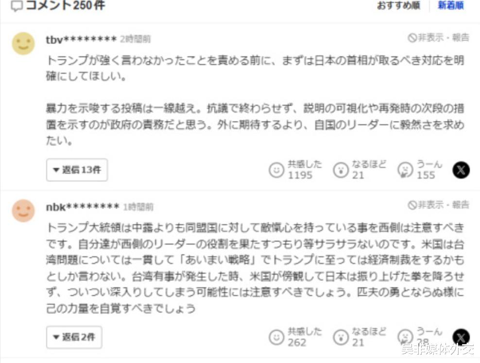 有日本网友评论称,与其责怪特朗普没有强硬表态,倒不如要求日本首相能够展现出应有的态度;
