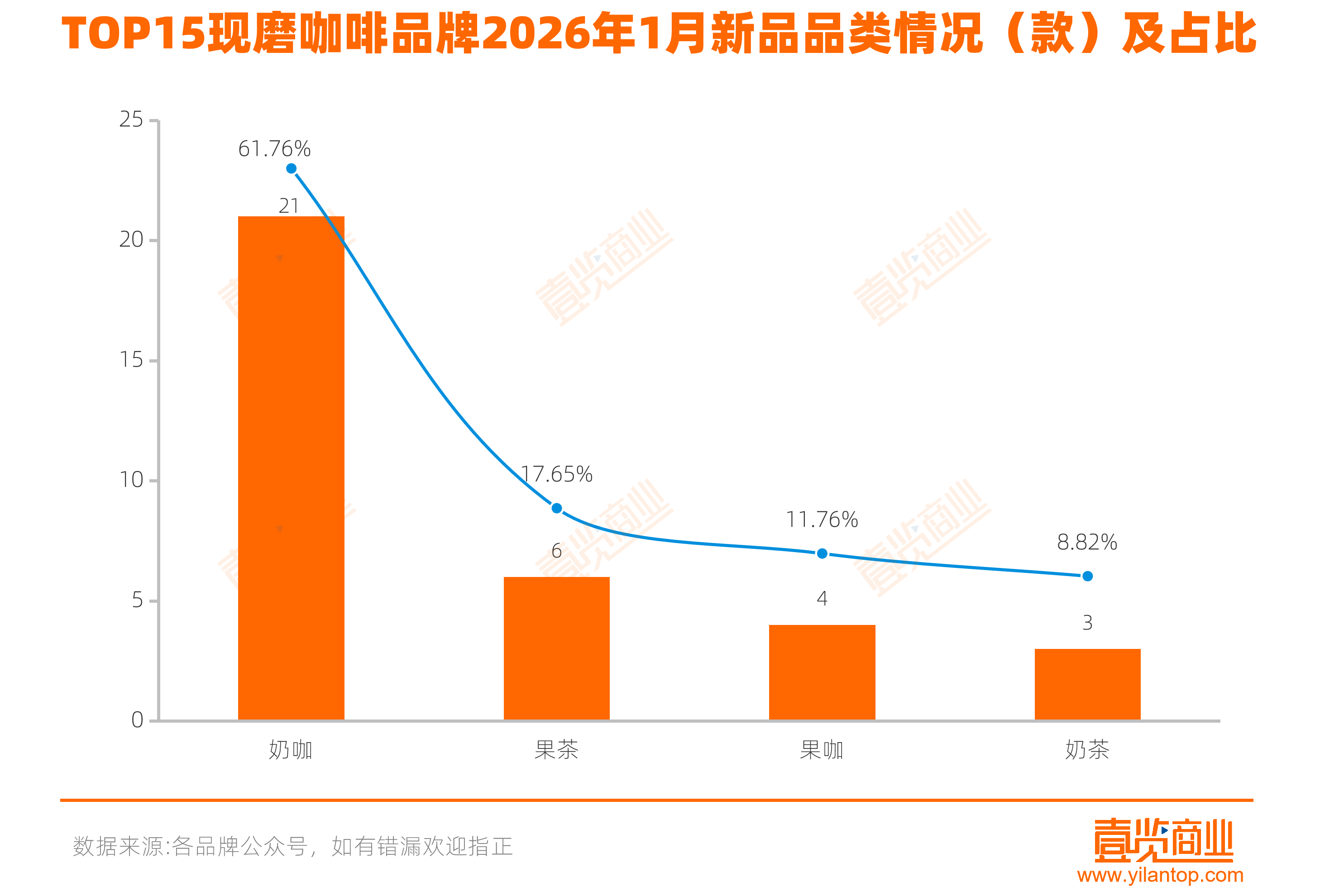 现磨咖啡品牌方面,奶咖成为上新的绝对主流,共上新21款,占比61.76%,果茶上新6款占比17.65%;果咖和奶茶分别上新4款和3款,表明现磨咖啡品牌也在积极拓展风味与品类的边界。