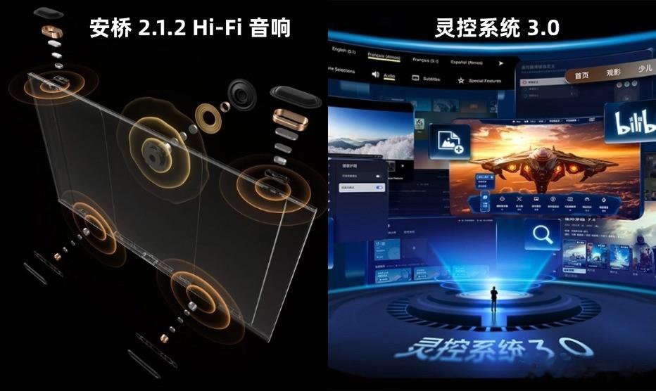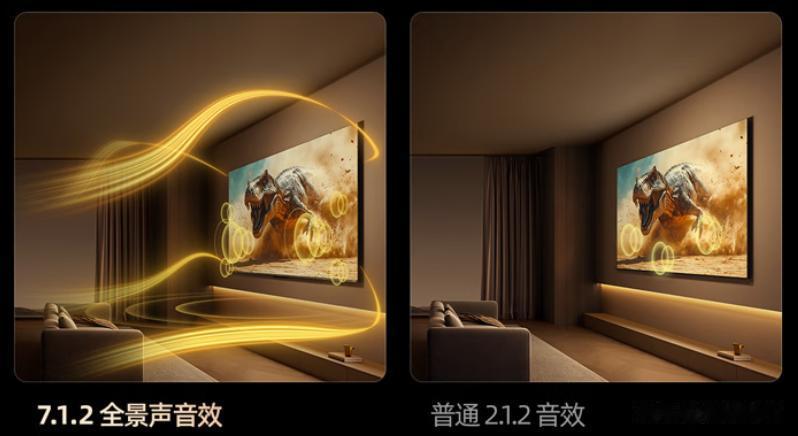 配置上,9655 + 芯片搭配灵控系统 3.0,无开机广告且支持全景刮削海报墙,安桥 2.1.2 Hi-Fi音响通过 Dolby Atmos 认证,沉浸感拉满。