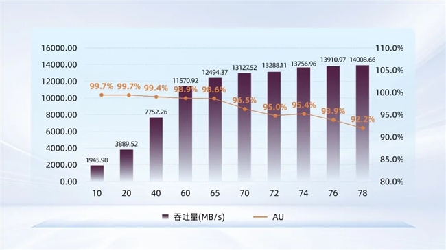 在ResNet-50场景测试中,我们共计训练了19163个文件,模拟了10至78颗GPU的训练过程。如图3所示,在模拟78颗H100 GPU的负载下,UH812a实现了14008.66 MB/s的最大吞吐量,GPU利用率稳定在92.2%,同样超过基准要求(AU>90%),体现出其能够为复杂训练任务持续提供充足的存储性能支持。