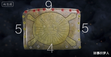 玉板上有9-5-5-4四组刻痕,还有诡异的太阳轮图案。