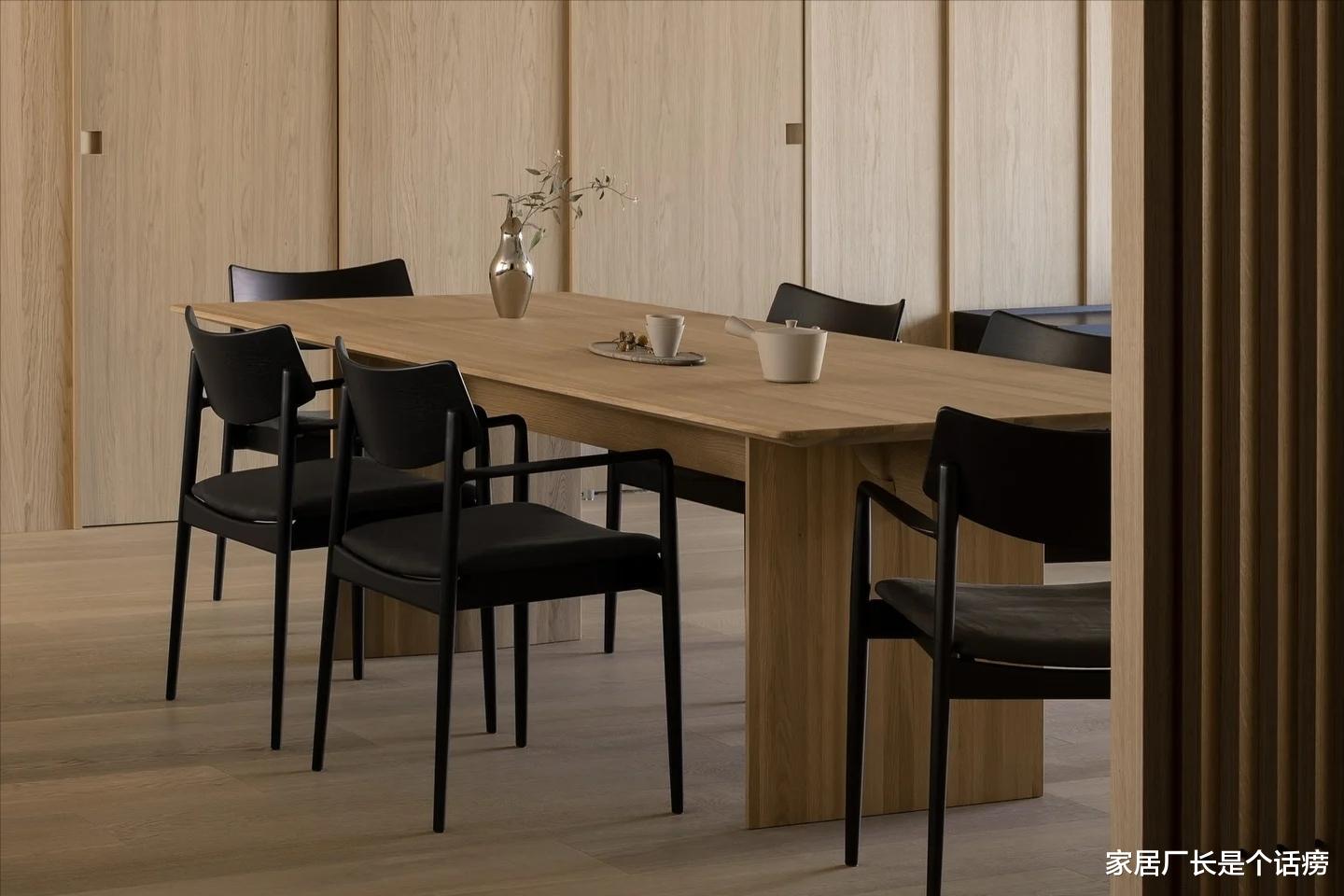 一两件设计出色的实木大件,就能让整个空间“活”起来。比如餐桌选大而厚实的,结实耐用,餐椅可以选细腿轻盈的,或者颜色差异化的,显空间大还能出对比感,效果更加耐看,反之也是如此: