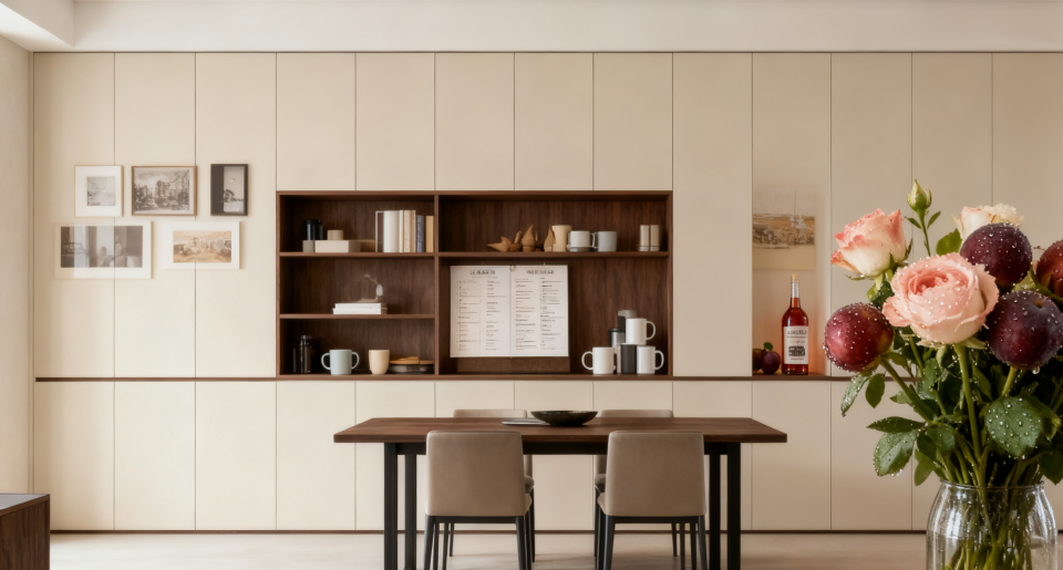 藏八露二:80%的柜门做成封闭式,收纳杂乱物品;20%做成开放式隔板,放书籍、摆件或常用物品,避免整面墙的压抑感。