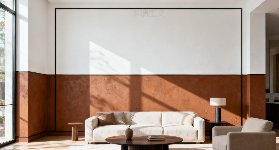 优势:成本极低,但能瞬间提升空间的层次感和设计感,比全墙单一颜色有趣得多。搭配带有细微颗粒感的艺术涂料,高级感扑面而来。