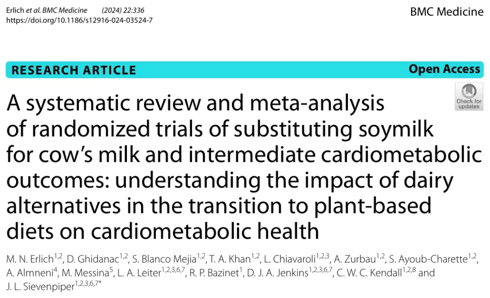 [4] ERLICH M N, GHIDANAC D, BLANCO MEJIA S, et al. A systematic review and meta-analysis of randomized trials of substituting soymilk for cow's milk and intermediate cardiometabolic outcomes: understanding the impact of dairy alternatives in the transition to plant-based diets on cardiometabolic health [J]. BMC Med, 2024, 22(1): 336. DOI: 10.1186/s12916-024-03524-7.