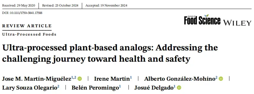 [2] MARTÍN-MIGUÉLEZ J M, MARTÍN I, GONZÁLEZ-MOHÍNO A, et al. Ultra-processed plant-based analogs: Addressing the challenging journey toward health and safety [J]. J Food Sci, 2024, 89(12): 10344-10362. DOI: 10.1111/1750-3841.17588.