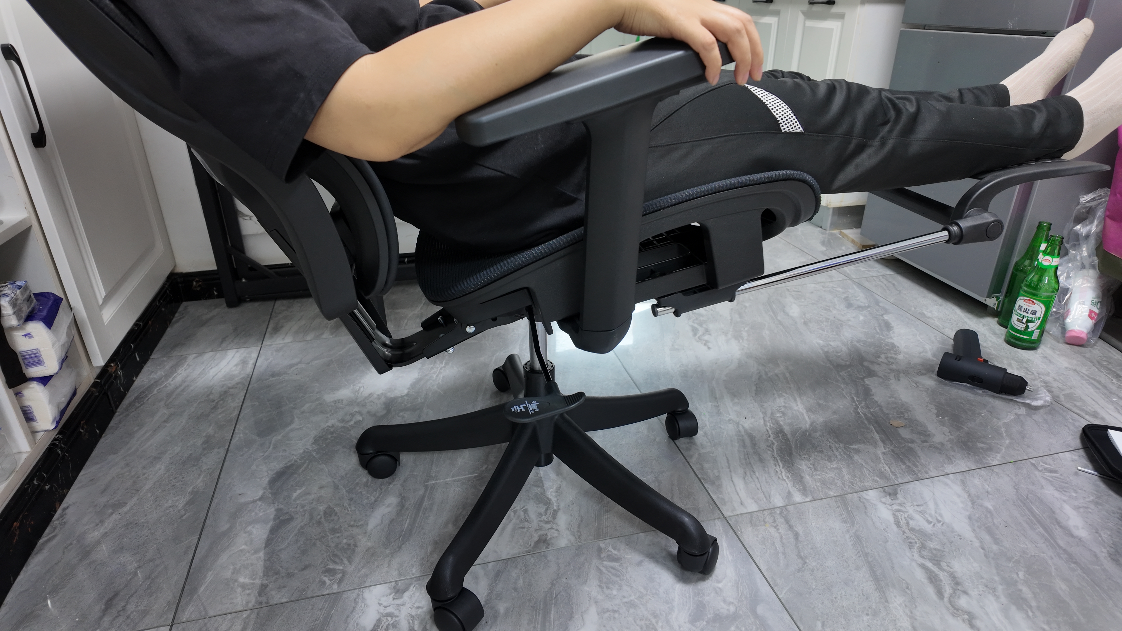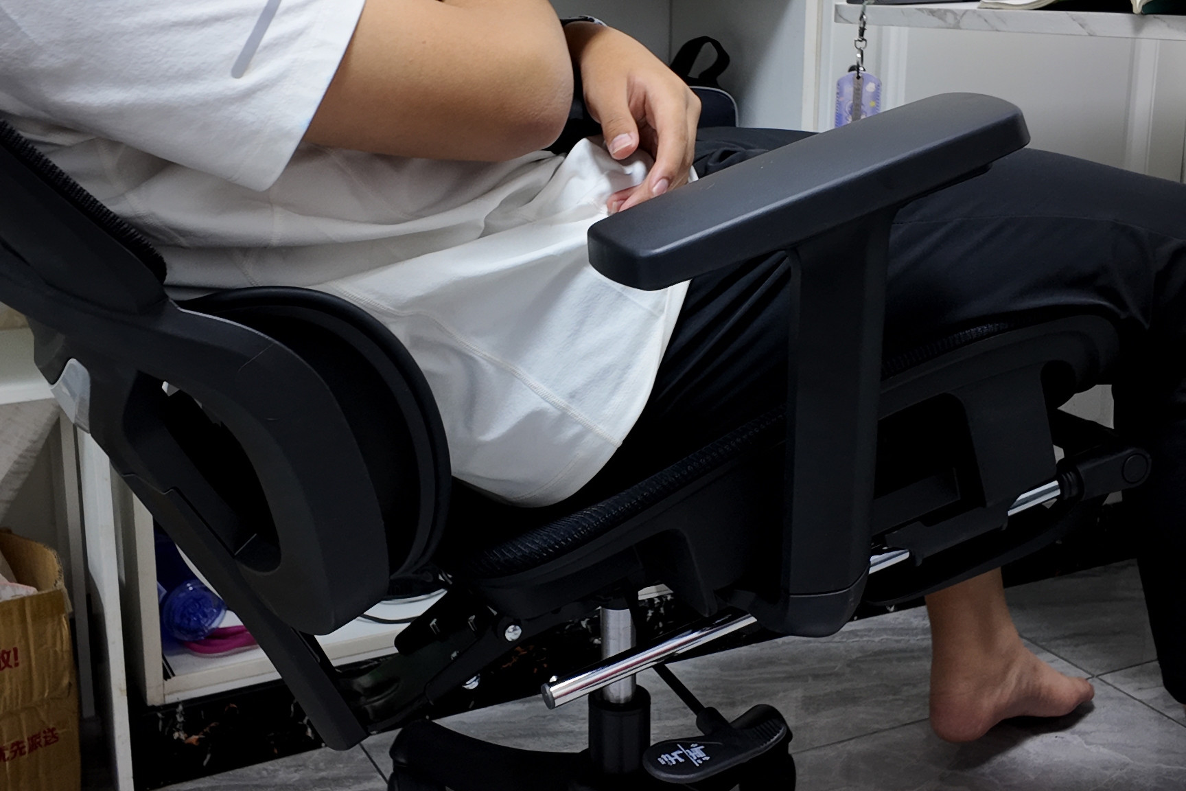 隐藏式可伸缩腿托的加入让产品实用性大幅提升。午休时轻轻拉出腿托,配合145°无极后仰角度,瞬间切换成舒适的休憩模式。第六代重力联动底盘展现出过人实力,能根据体重自动调节后仰阻力,180斤测试者后仰过程顺滑稳定,无任何卡顿或晃动。