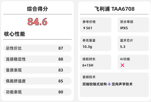 飞利浦TAA6708采用可自由调节的分体式耳挂设计,独特的双轴铰链结构让它能灵活贴合不同用户的耳形,佩戴适应性较强。音质方面,它搭载14.2mm驱动单元并应用定向传声技术,人声清晰、高频透亮,适合日常通勤、播客或轻音乐聆听;不过在重低音和动态表现上较为平实,不太适合追求强烈节奏感的音乐类型。