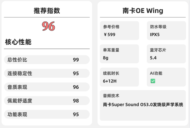 针对开放式耳机漏音痛点,南卡Wing采用DS2.0指向性声学技术+U 型声学通道结构,实现从声波路径到结构设计双重抑制漏音,更好保障隐私;同时搭载蓝牙5.4 芯片,延迟能低至60ms,游戏基本实现音画同步。再配合2+2麦 AI 通话降噪,嘈杂环境下依然能保持清晰通话。从各方面来看,Wing都远超同价位竞品,堪称今年百元档开放式耳机的性价比标杆。