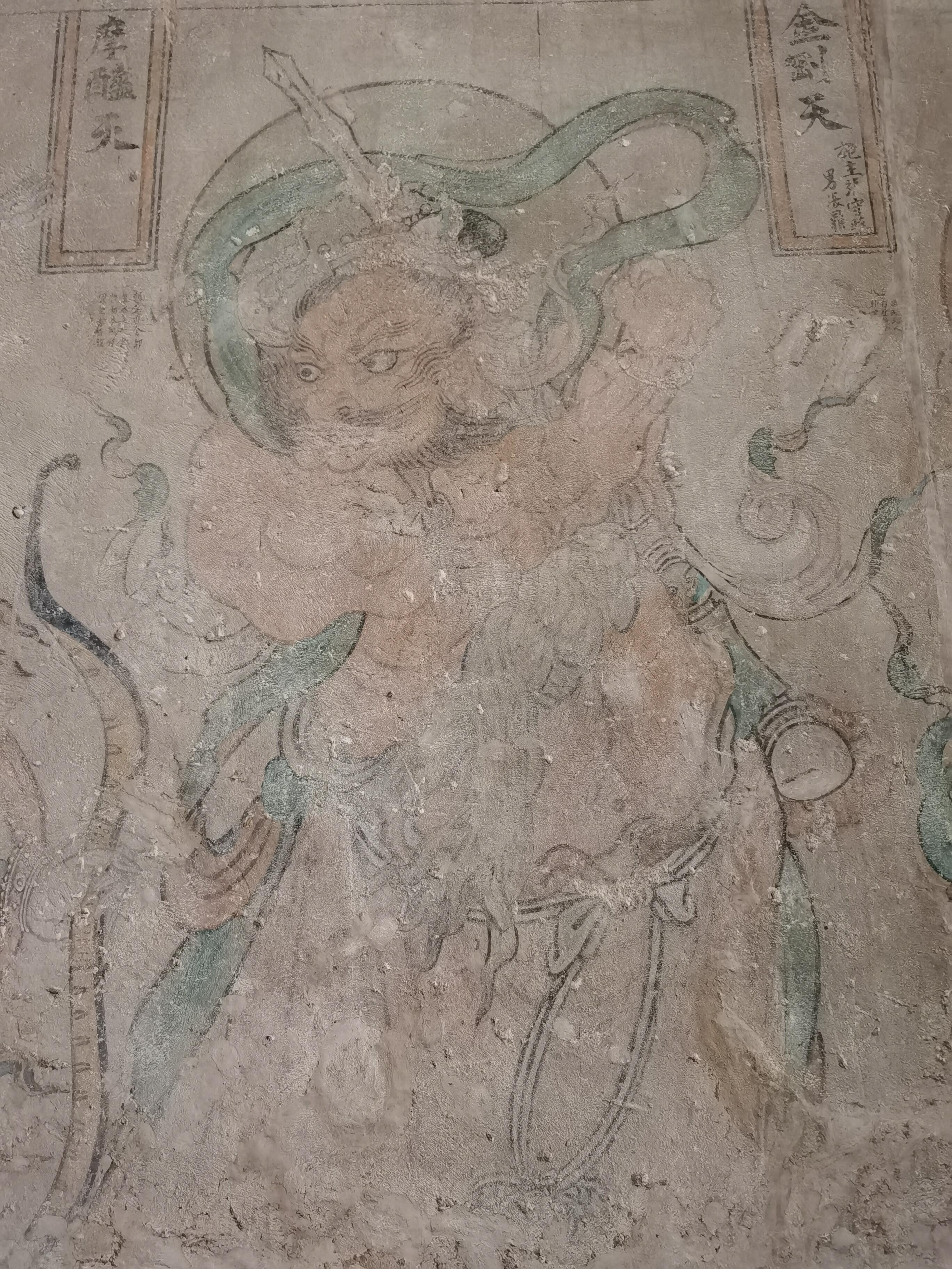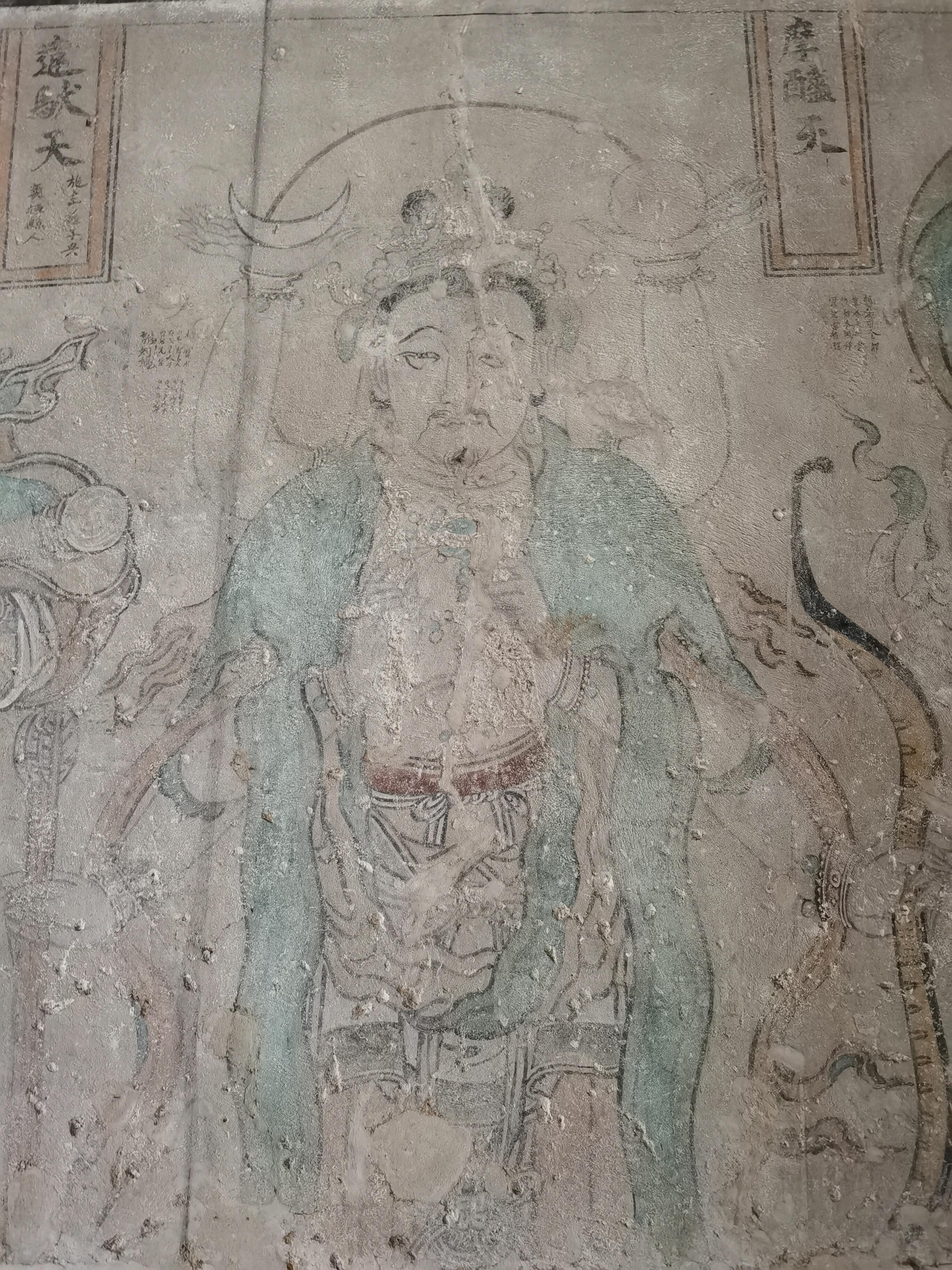 站在壁画前,能清晰看到岁月留下的痕迹。部分墙面因受潮剥落,露出底下的泥层;金粉也在漫长时光中氧化变黑,失去了往日的光泽。但正是这些残缺,反而让壁画多了份沧桑之美。想象八百年前,画工们站在脚手架上,一笔一画勾勒出这些天神形象时,该是怀着怎样的虔诚与专注。他们或许未曾想到,自己的作品会在几百年后重见天日,成为研究元代宗教艺术的重要实物资料。