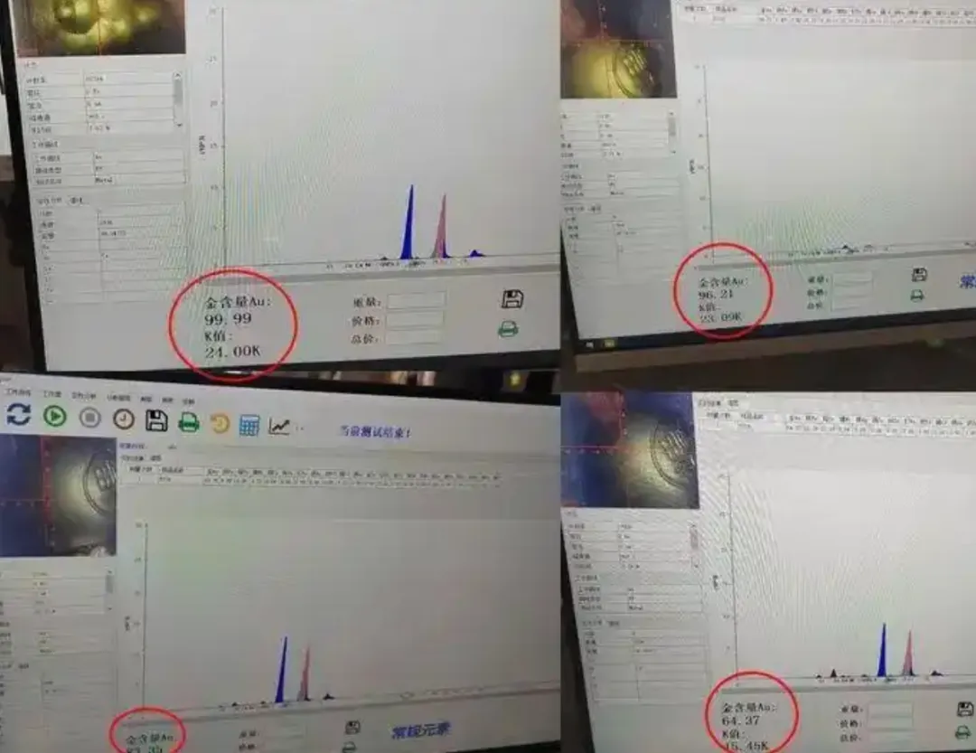 1月27日,李女士将挂坠送到当地一家黄金回收店进行光谱检测,结果显示挂坠不同点位金含量差异巨大,且含有铁、银、钯等元素。