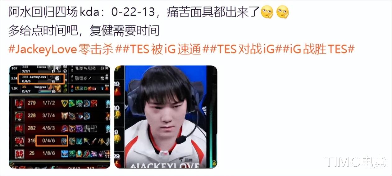 先看最离谱的重头戏——TES对战IG!本以为是新老豪门的神仙掰头,结果硬生生变成了IG的单方面碾压秀,2:0干净利落零封TES,两局加起来都没撑过50分钟,妥妥的“速通局”,TES全程被按在地上摩擦,连一点反抗的机会都没有。而最让人笑喷的,当属JackeyLove(阿水),回归TES四场比赛,合计战绩居然是0-22,一个人头没拿,倒送了22个人头,KDA低到刷新下限,说出来都没人敢信!更有网友直呼theshy(1-16)对不起!
