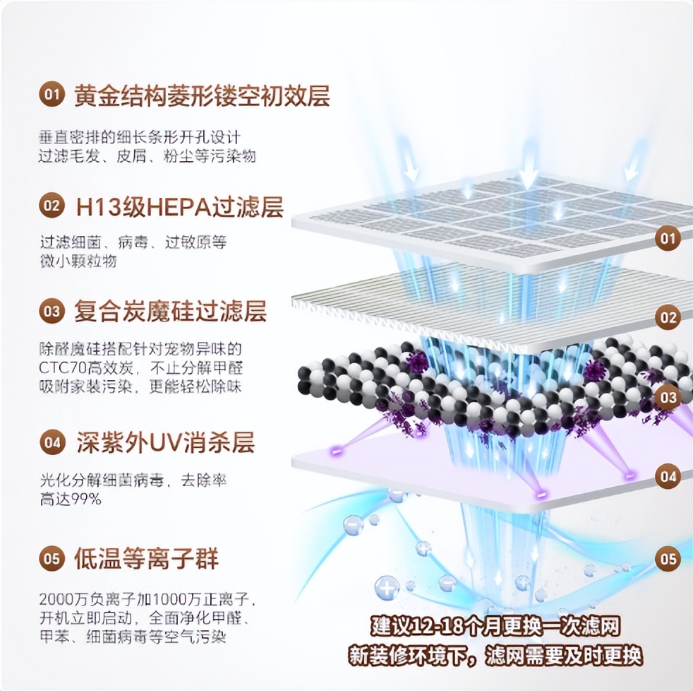 采用 “HEPA H13 级滤网 + 复合炭魔硅过滤层 + 紫外UV消杀层” 复合结构,集过滤 PM2.5、除菌、除醛于一体,避免单一功能滤芯快速饱和;