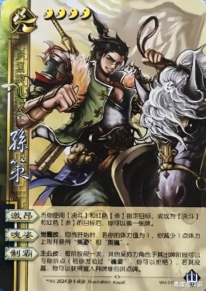孙策是三国杀首个具有觉醒技能的武将,其历史性的机制创新自然不必多说。前期半白板,都是为了后期【魂姿】觉醒!虽然孙策觉醒难度大,必须是一点血量,但就冲着一个孙策还能同时玩到孙坚和周瑜三人,这还不阴?