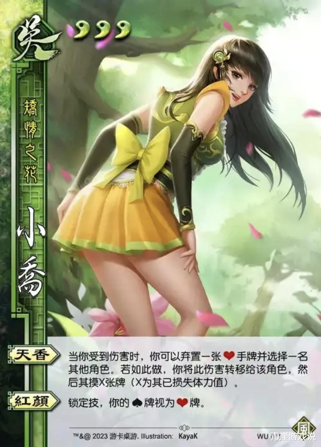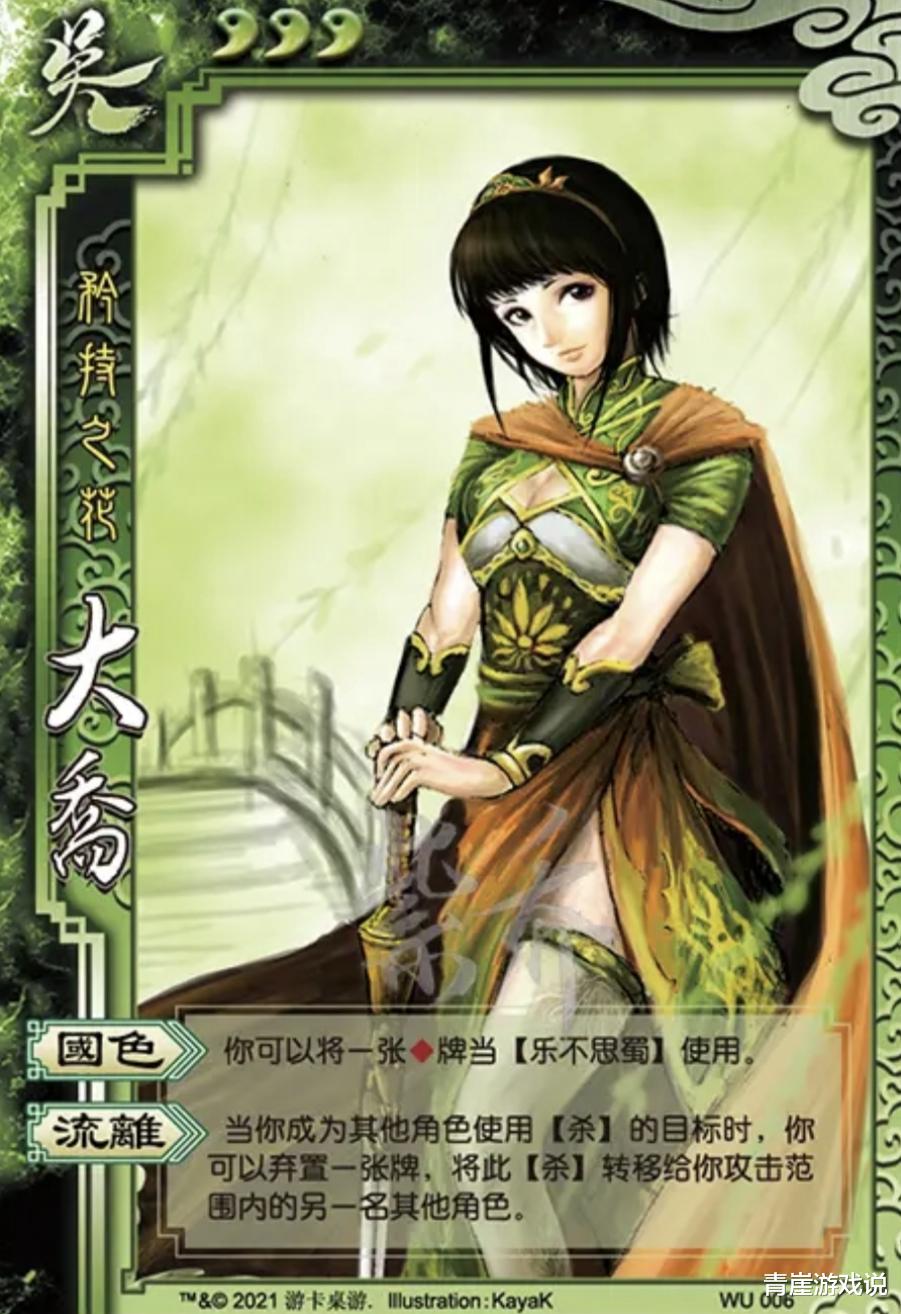大乔则是概念神,纯粹是控制能力在早期三国杀里独树一帜!【国色】的方块牌都能当成乐不思蜀,只要大乔运气够好,就能把一个敌人针对的痛不欲生。更离谱的是,大乔【流离】同样能保护好自己。正是因为太过恶心,大乔在早期的村规中是被禁玩的顶级存在!
