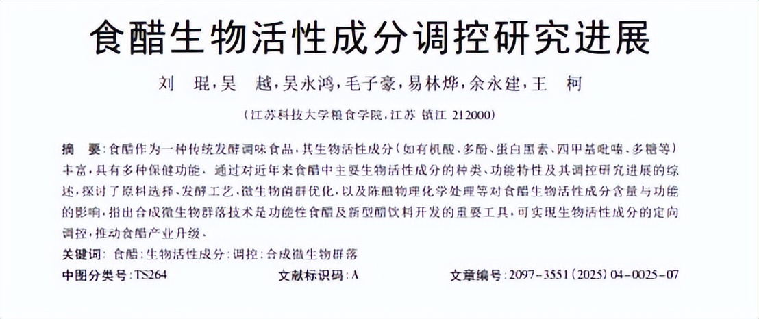 [1]食醋生物活性成分调控研究进展 刘 琨,吴 越,吴永鸿,毛子豪,易林烨,余永建,王 柯 粮油科学与工程 2025-07-28