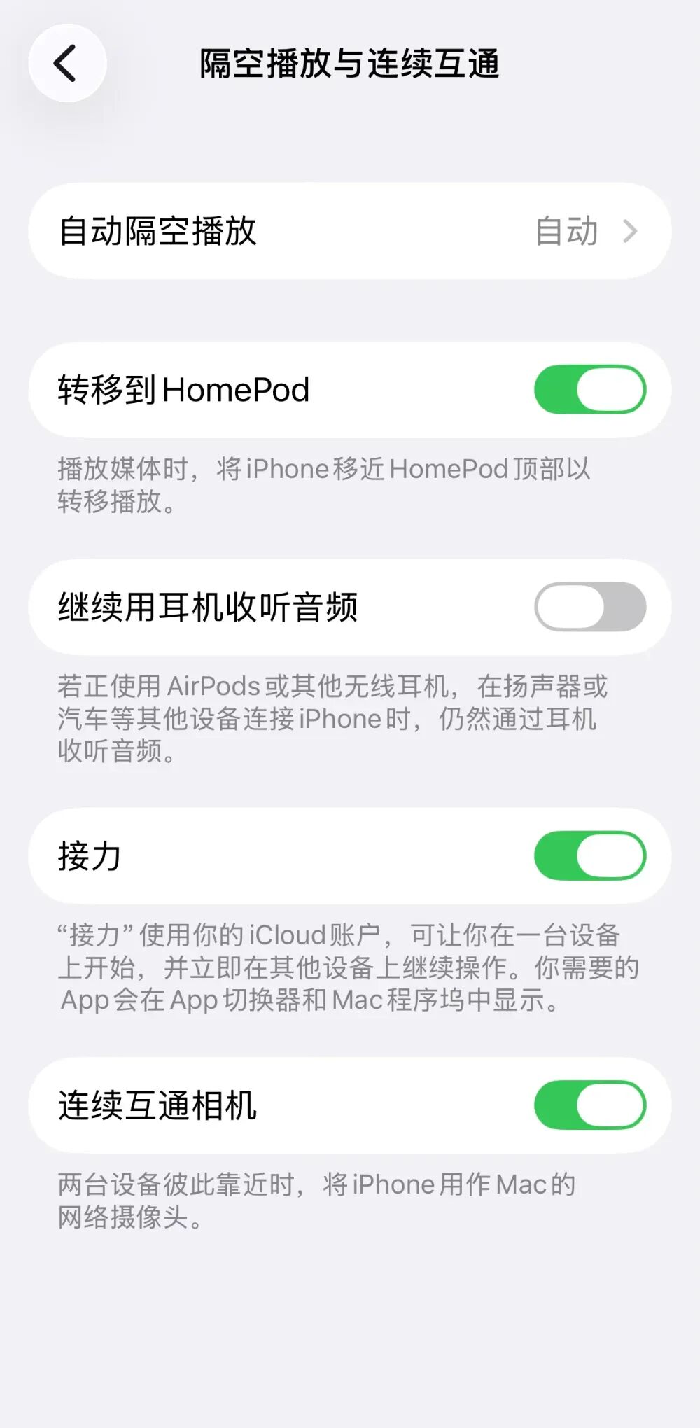 在iOS 26 中,用户可以通过“设置”→“通用”→“隔空播放与连续互通”→“继续用耳机收听音频”路径调整。