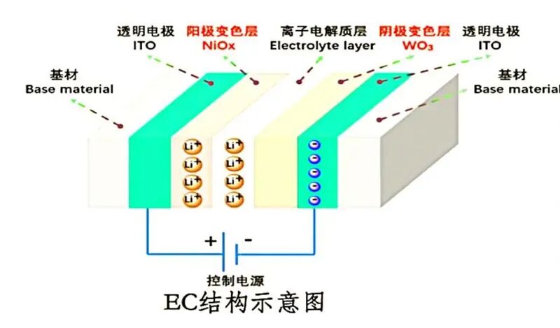 与LC的电场控制、物理调光不同,EC技术是通过“可逆氧化还原反应”实现调光。其核心结构包括电致变色层(如三氧化钨WO₃)、电解质层和离子存储层。