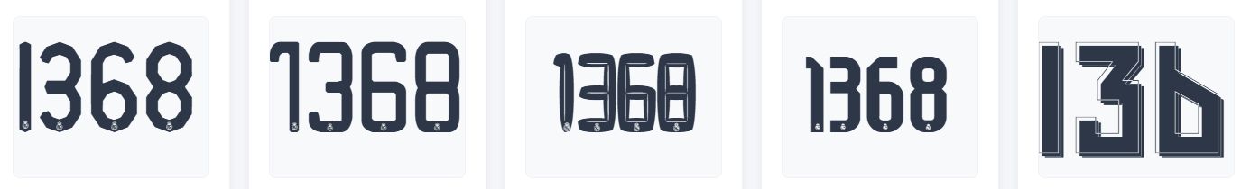 进入 21 世纪初,皇马的球衣字体选择了极具辨识度的 Stencil 模板体。这款字体以硬朗的镂空线条为核心,笔画粗重、结构方正,仿佛是从工业设计图纸中直接拓印而来。在那个年代,这种设计不仅契合了足球运动的力量感,也完美适配了当时主流的刺绣工艺 —— 粗重的线条能牢牢固定绣线,让号码在激烈对抗中不易脱落。