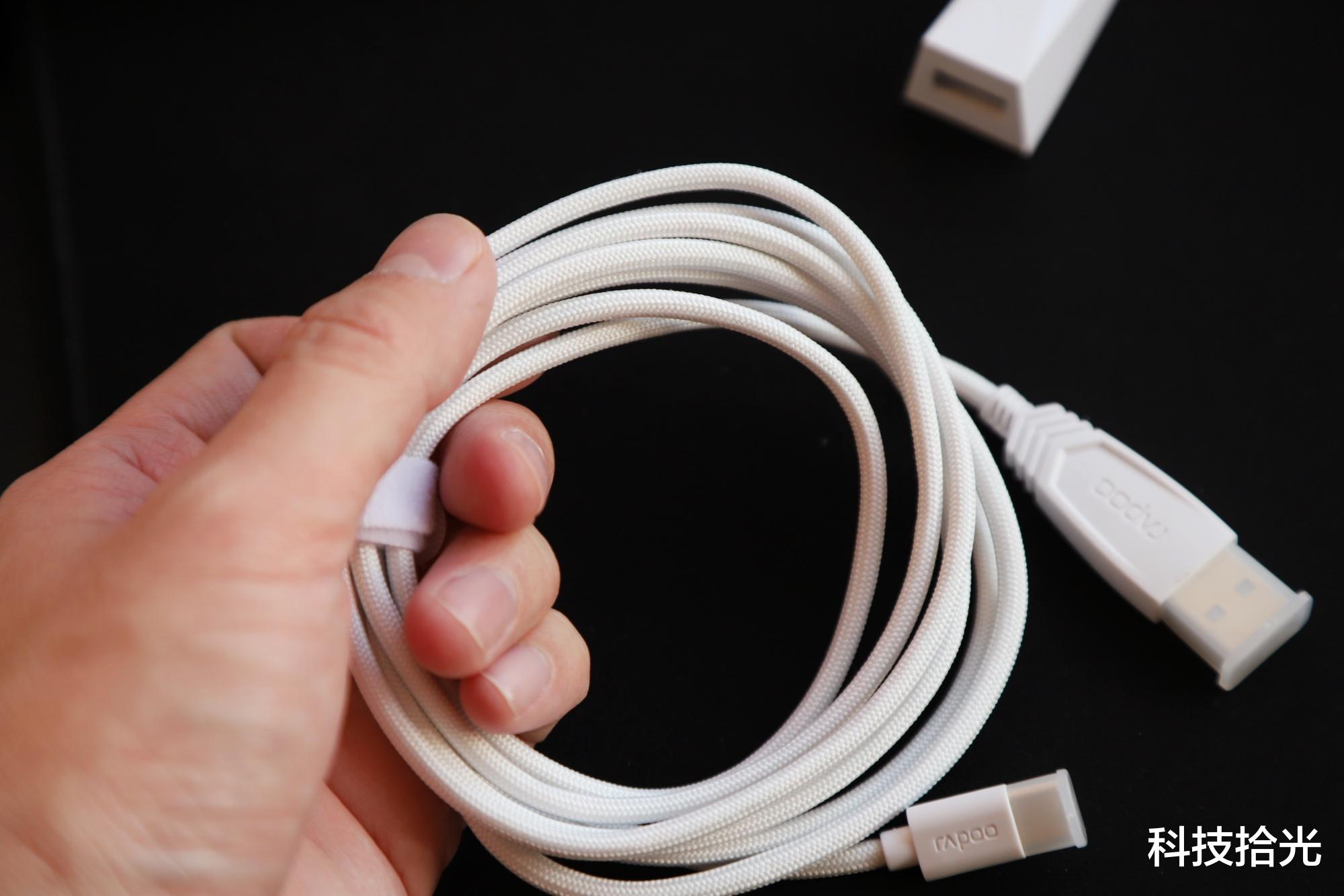 包装全家福。除鼠标本体外,还有说明书一份、白色伞绳数据线、白色USB转接器、备用更换脚垫、侧裙防滑贴、按键防滑贴。配件可谓一应俱全,鼠标周身能贴的都送齐了。这里说一下赠送的脚垫是PTFE特氟龙材质,搭配雷柏的鼠标垫,摩擦低,十分耐磨,移动体验非常丝滑。