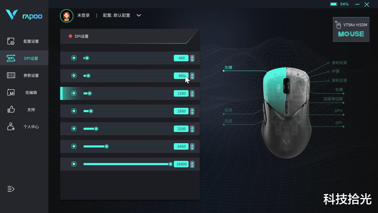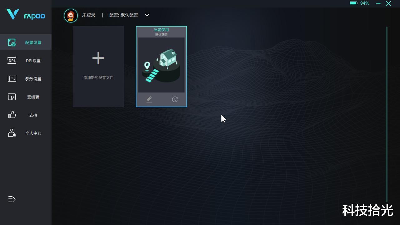 雷柏外设都可以去官网进行驱动下载。驱动界面依旧是熟悉的黑蓝风格,包括配置设置、DPI设置、参数设置、宏编辑、支持和个人中心模块。另外可以看到驱动的底部依旧有鼠标剩余电量的指示模块,非常直观。