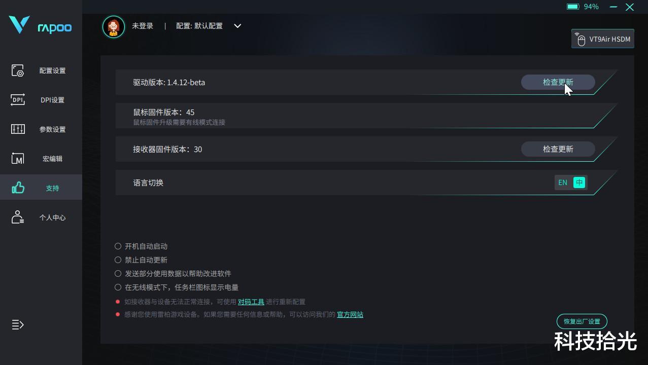 在支持模块,可以进行鼠标接收器和鼠标本体的在线OTA升级,随时更新下固件版本能获得更好更强的鼠标体验。
