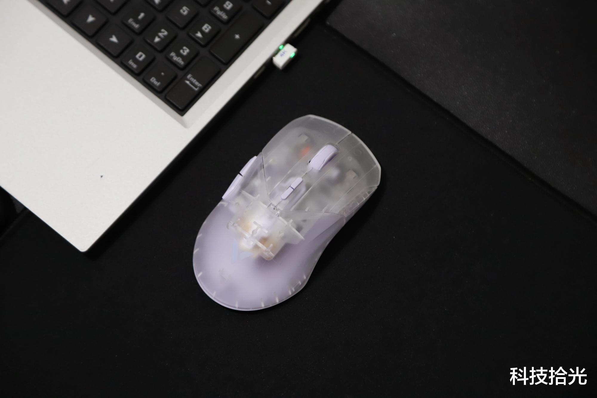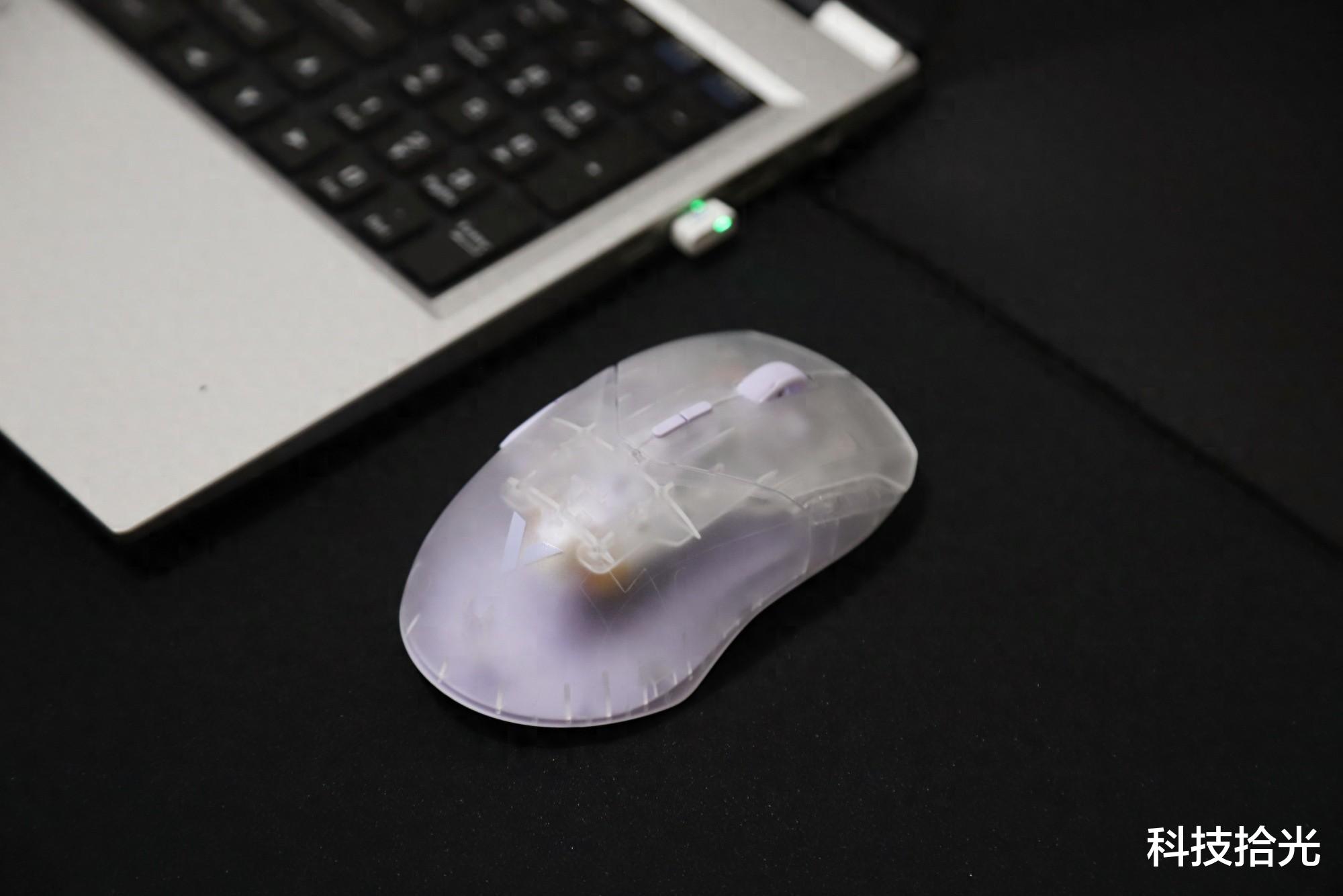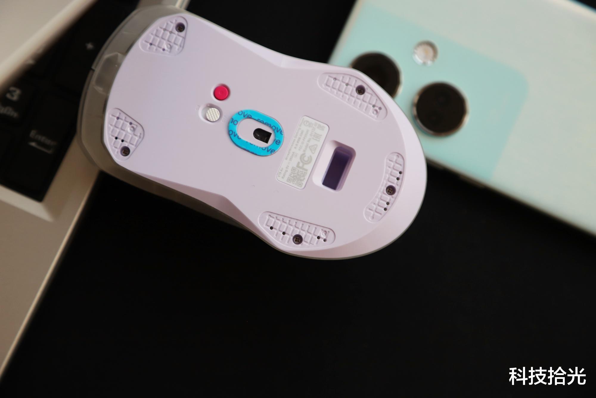 闲话少叙,直接进入本体展示环节。我的这款是紫色的“星霜”配色,一眼看去:鼠标滚轮、DPI调节键、鼠标侧键和鼠标底部均为淡紫配色,和半透外壳搭配看起来十分梦幻,科技感十足。相比于我之前在用的ROG 战刃2的遮遮掩掩,雷柏VT9Air就大胆的多,骨骼和棱角的视觉体验更充实直接。另外,直男用紫色,真的是个好选择(邪恶的笑)。
