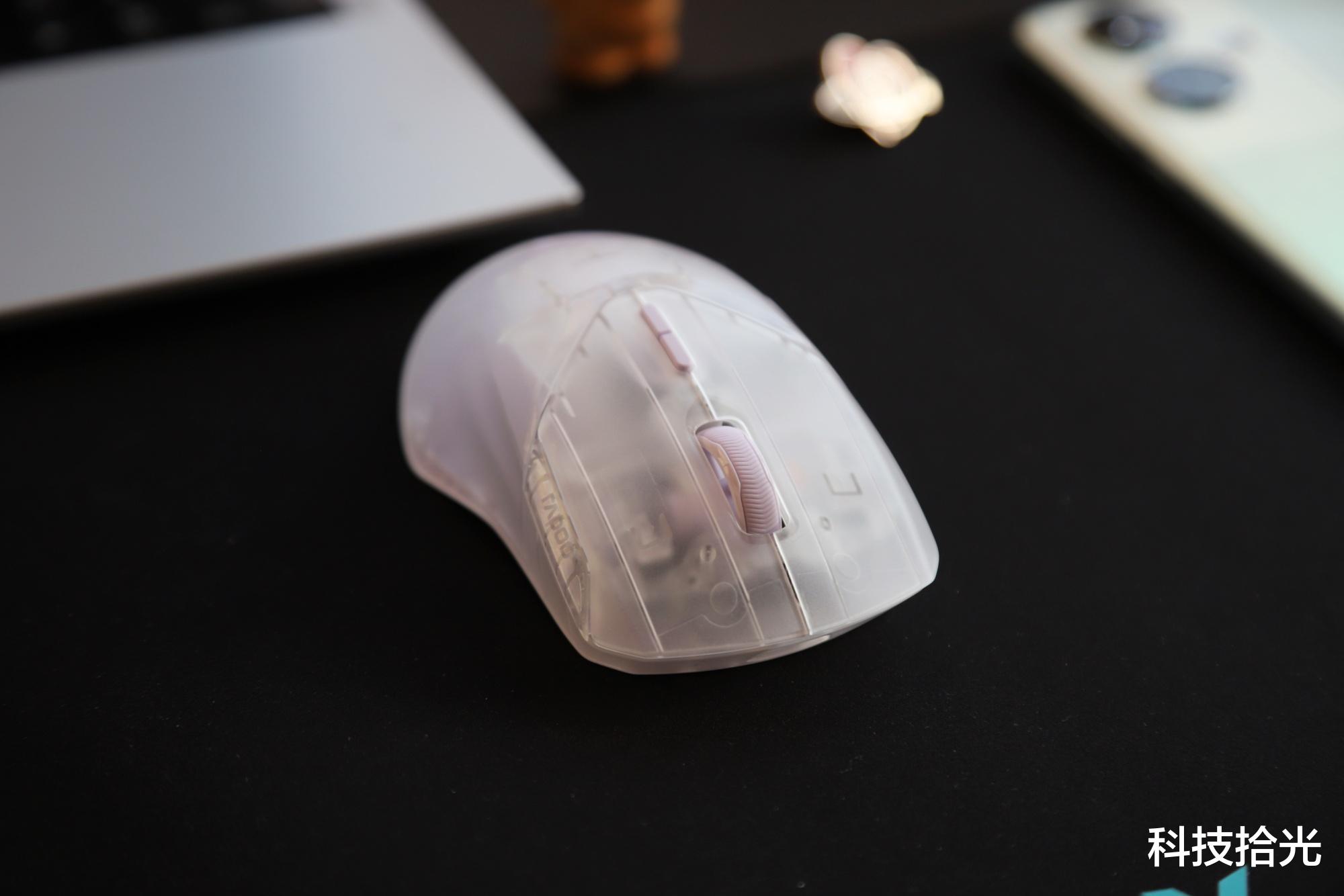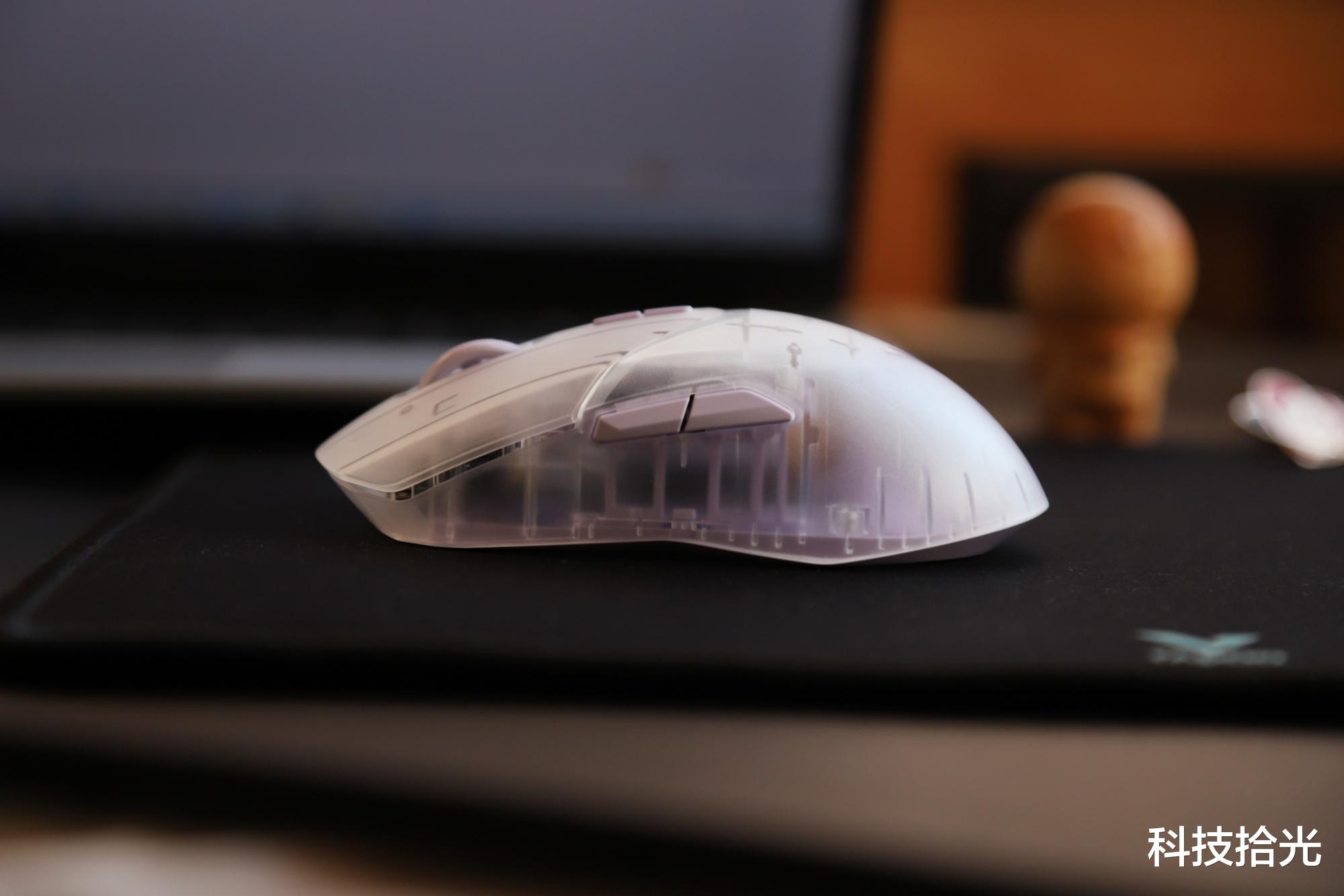 鼠标一共有7枚独立按键和1个滚轮。鼠标的左右大键也是半透风格设计,直观视觉有竖线条纹,并能隐约看到里面的橙色滚轮微动,独有一番风味。