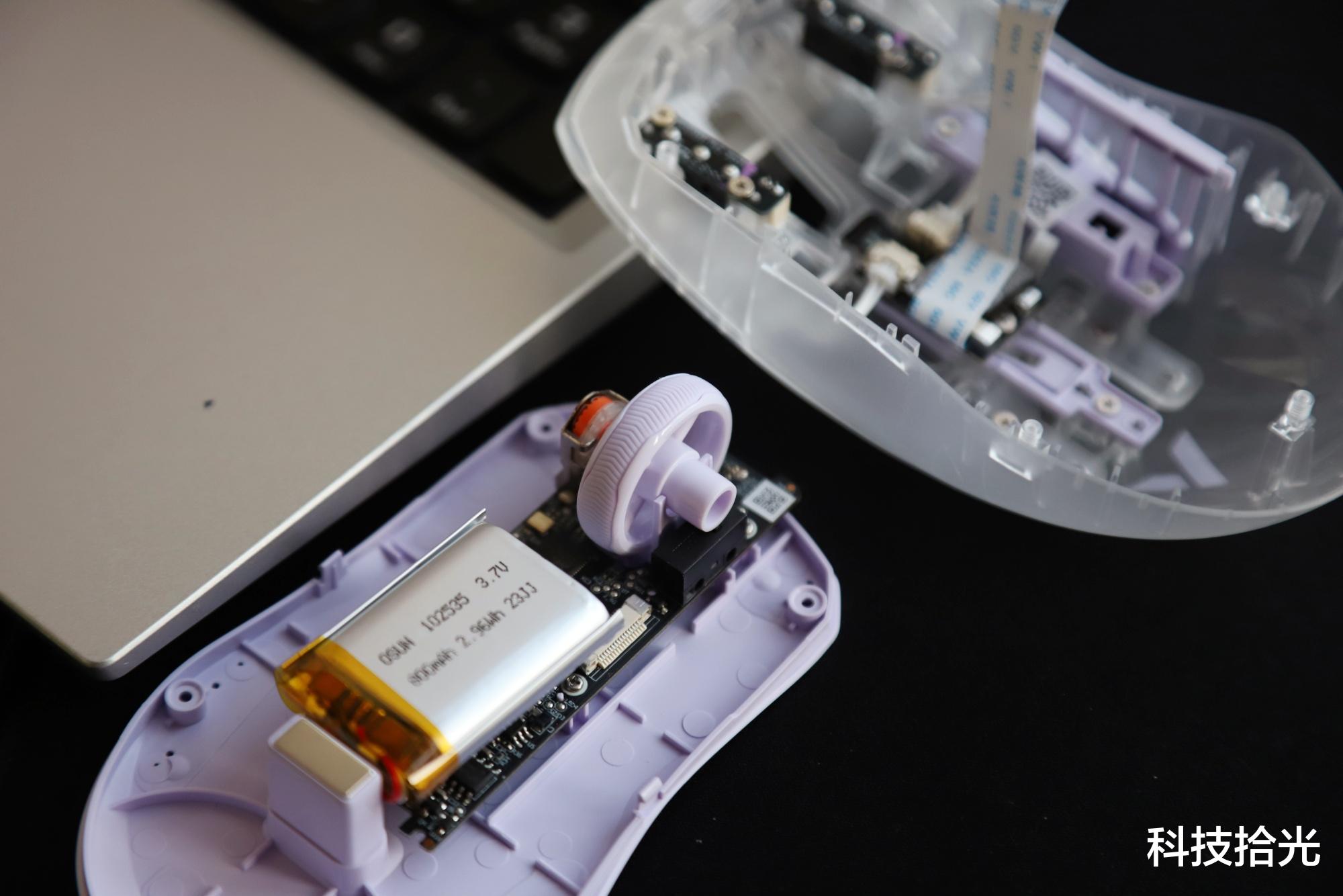 因为都是单独设计,包括微动、侧按键等,这样也给了玩家更多的自由度。如果你是个高端玩家,给鼠标换个新微动再也不像以前给老鼠标换微动那么复杂了。甚至包括鼠标的电池,会点焊接技术,换个电池也不是不可以。细节观察可以看到在鼠标微动的下方有一枚小弹簧,可以调整预压行程,改变软弹、脆硬的手感。安装两个不同的微动,可以应对不同的游戏需求,我感觉鼠标都快变成DIY组装的了。