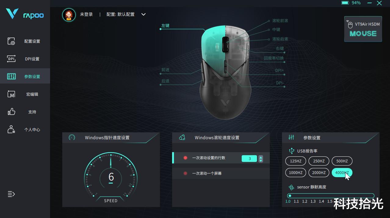 参数设置这里除了大家常见的指针速度、滚轮速度调节外,能够直观的看到USB回报率设置。在接收器链接模式下,最高档位是4000Hz,另外静默高度支持1.0到2.0的11档调节。