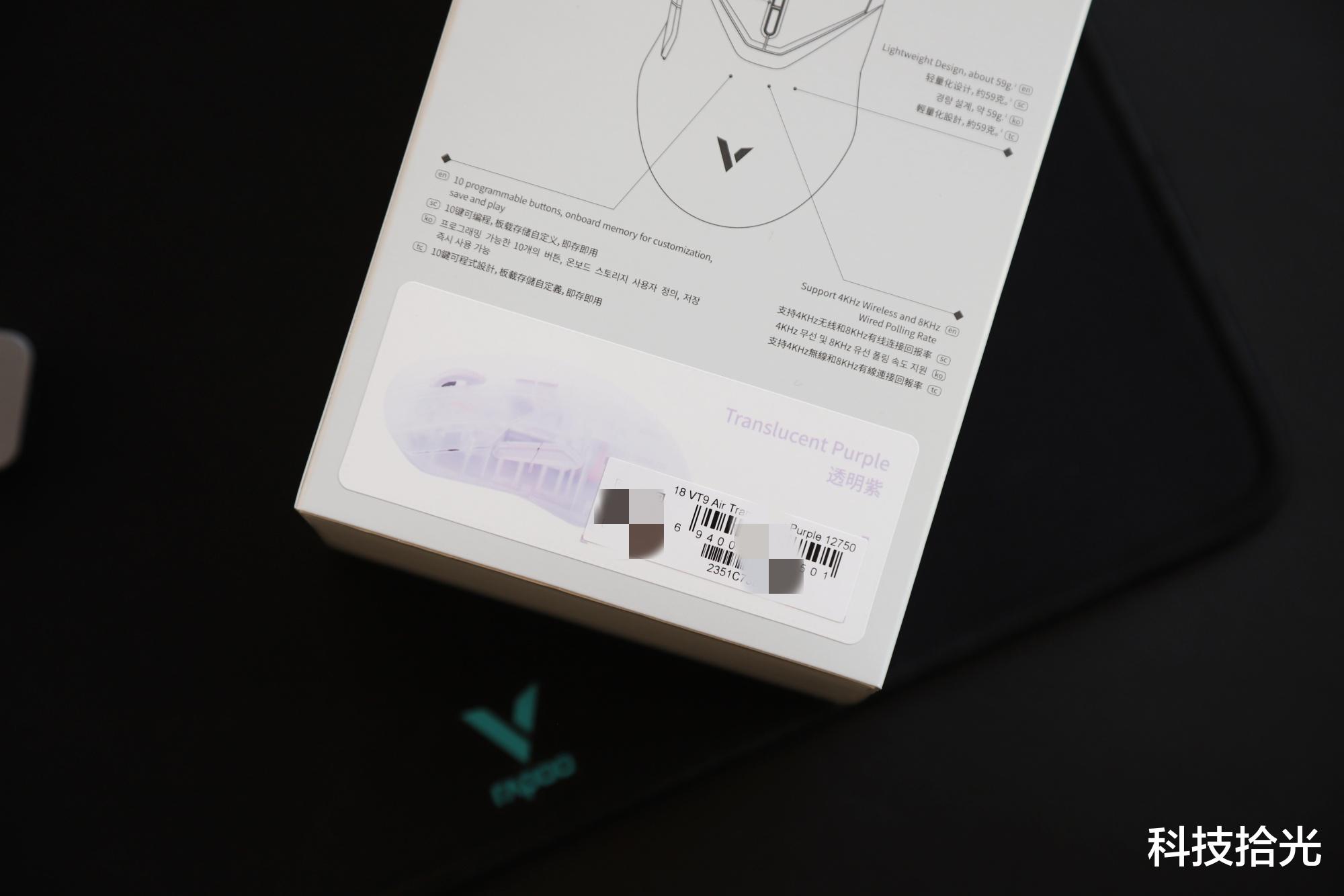 作为新款电竞级旗舰鼠标,半透款风格的雷柏VT9Air,从包装盒的设计都与“众”不同:流光溢彩风格的油印包装,在光线下显得炫彩异常,一般这种包装盒我在高端HIFI耳机的包装上才能看到,蛮有辨识度的。