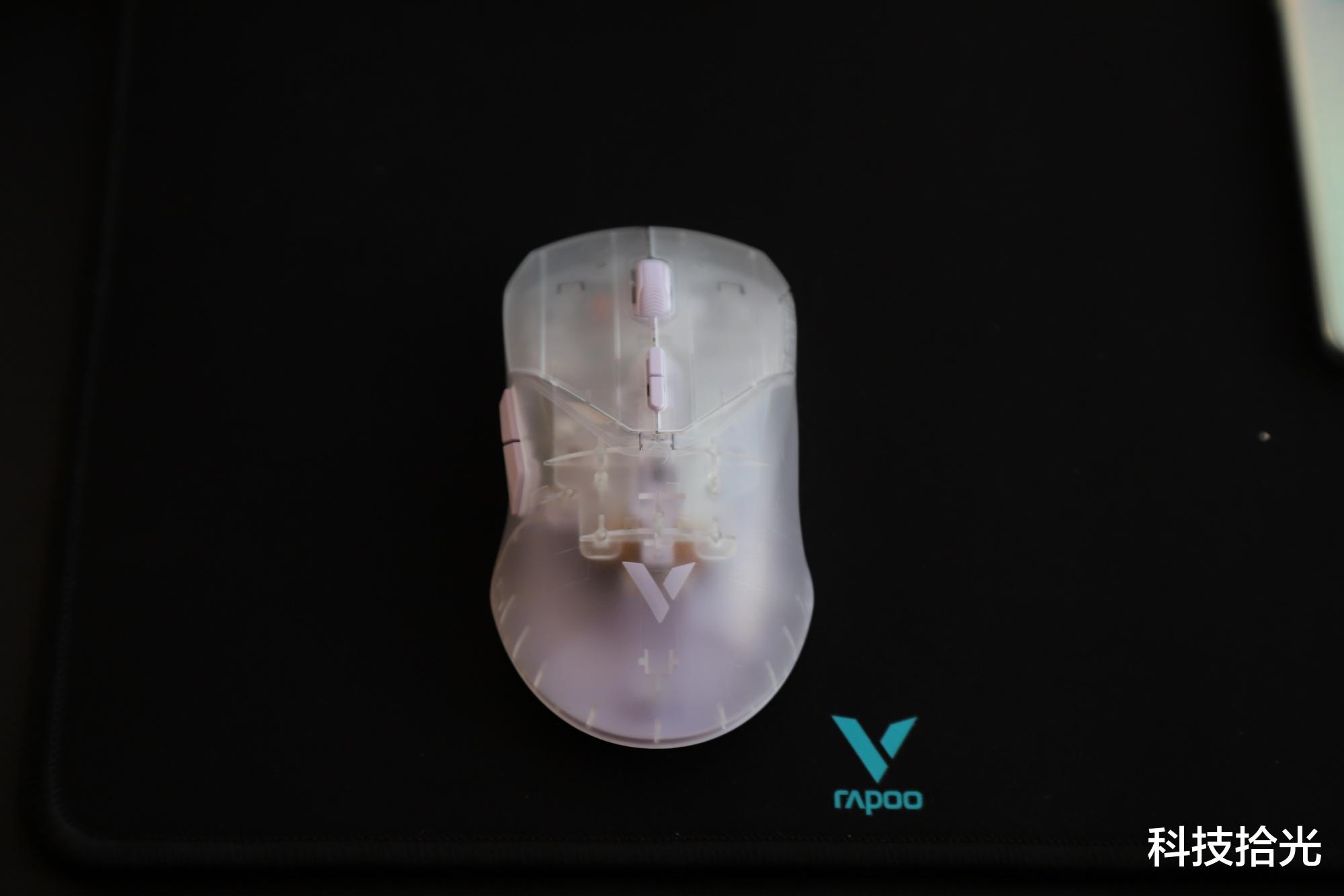 鼠标整体依旧配重靠近后部,整体鼠标最高点大约在手掌心位置,也同样靠近鼠标后部,这对于长时间玩家使用鼠标会给与更好的支撑感,不易疲累。最尾部还有雷柏专属的“V”标识,不过这个标识仅为印刷,并没有额外的LED灯效,想必也是考虑整体鼠标的续航考量。不过有没有DIY大神可以自行装一个LED造型灯?岂不是美滋滋。
