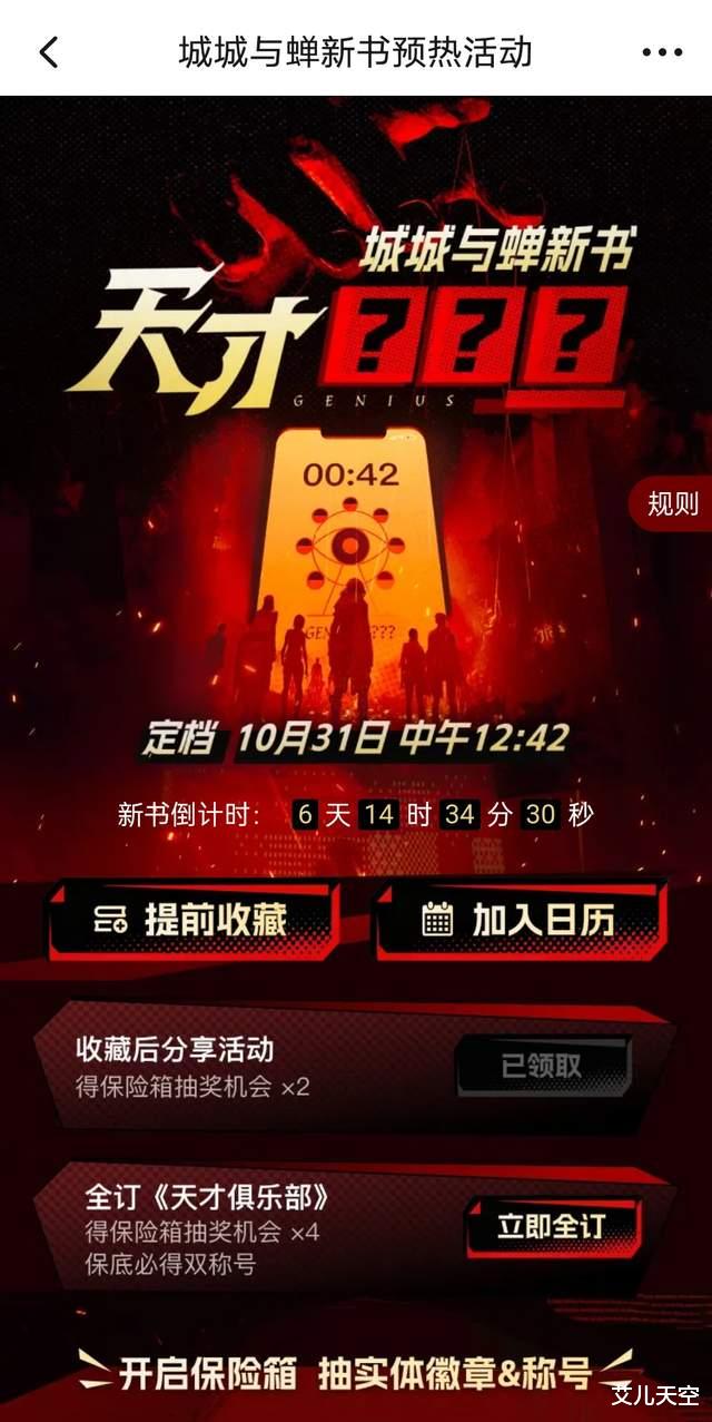 城城与蝉上本《天才俱乐部》十万订以上的成绩,各种版权开发也都安排了,现在开书直接拿到了七天预热收藏活动。这比开书当天安排活动的规格要更高一级,这次看着还是五字书名,剩下三字需要猜猜猜。有兴趣的也可以去参加一下看看。