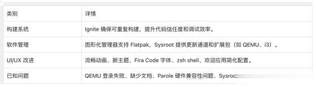 在基于 QEMU 的虚拟机上,初始登录可能失败,但重试后可解决,真实硬件上无此问题。部分应用和命令缺少 man 页和文档,影响高级用户的使用。Parole 视频播放器在特定图形硬件上可能出现问题。Sysroot 扩展包在首次启动后需要系统更新才能生效,可能对新用户造成困惑。QEMU 扩展的网络配置与 virt-manager 可能不兼容,默认网络未配置。Sway 扩展在 NVIDIA GPU 上可能失败。软件中心首次启动可能使用 Adwaita(light)主题,可通过设置->外观调整。开发团队正在积极解决这些问题,建议用户关注 GitHub 问题页面 获取最新进展。