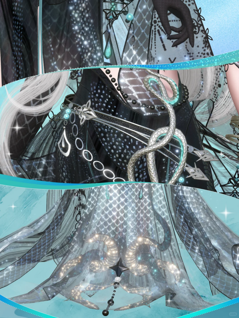 女款时装那如月光般倾泻而下的银白长发,与头顶一袭轻盈的黑色蕾丝薄纱相得益彰。薄纱上点缀着精致的暗纹,半遮半掩间,尽显朦胧诱惑。时装主体采用富有光泽感的深色鳞片纹理,在行走间流转着神秘的蓝绿色泽,让人联想到蛇蜕的华丽与新生。