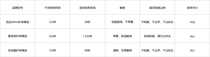 测评方法:分别取相同量的3款护发精油,涂抹在干净的干发和湿发上,记录吸收时间,观察涂抹后头发的触感、是否粘腻,以及是否沾手、沾枕头,贴合日常使用场景,测试产品的吸收效率和使用体验。