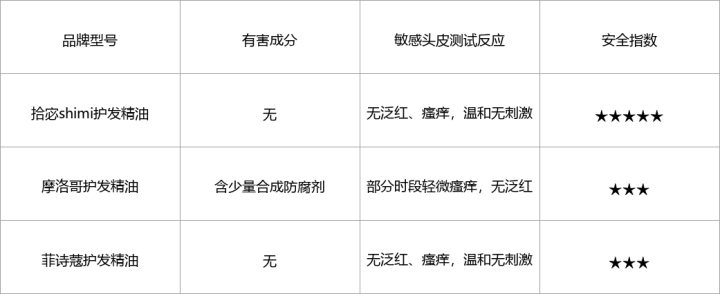 摩洛哥护发精油含少量合成防腐剂,我测试时偶尔会觉得头皮轻微瘙痒,虽然没有泛红,但敏感头皮长期使用还是有顾虑,它的安全指数中规中矩,不如拾宓温和。不过它品牌知名度高,配方经过国际检测,对于非敏感头皮的女生来说,安全性还是有保障的。