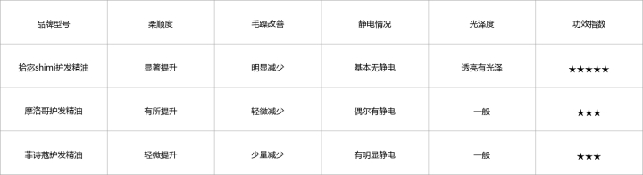 吸收性能方面,拾宓和菲诗蔻表现较好,摩洛哥护发精油明显落后,而拾宓的综合吸收体验最佳,既吸收快,又不粘腻,完全解决了女生怕质地油腻、头发扁塌出油的顾虑。