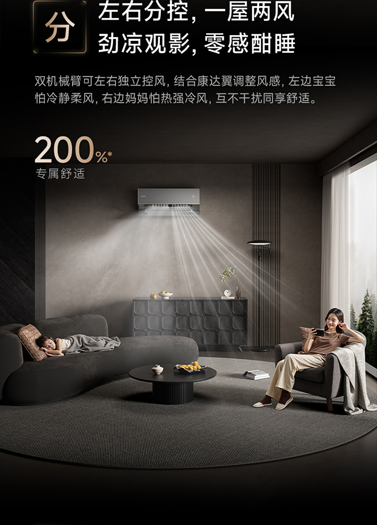 更为创新的是,追觅双机械臂空调支持左右分区送风。其双机械臂可以独立控制左右两侧的送风角度,实现“一侧强风、一侧柔风”的个性化送风模式,完美解决了一家人对风感需求不同的矛盾。