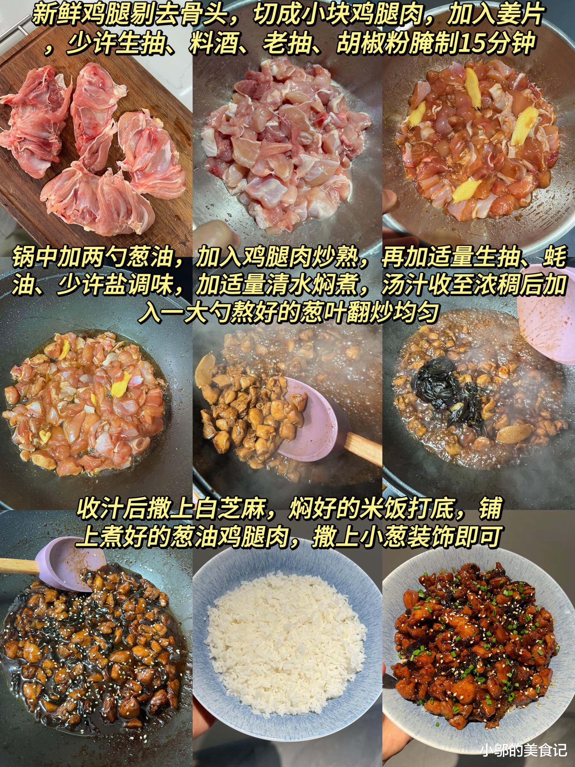 制作葱油鸡盖饭,从选材开始。新鲜的鸡腿肉是这道菜的灵魂,它肉质紧实,口感鲜嫩,远胜于鸡胸肉的干柴。将鸡腿剔去骨头,切成大小均匀的小块,这样不仅更容易入味,也更方便食用。切好的鸡腿肉放入碗中,加入姜片、少许生抽、料酒、老抽和胡椒粉,抓拌均匀,腌制15分钟。这一步是去腥增香的关键,姜片与料酒能有效去除鸡肉的腥味,而生抽、老抽则为鸡肉打上底色与咸鲜味,胡椒粉则增添了一丝微辛的香气,让鸡肉的味道更加丰富。