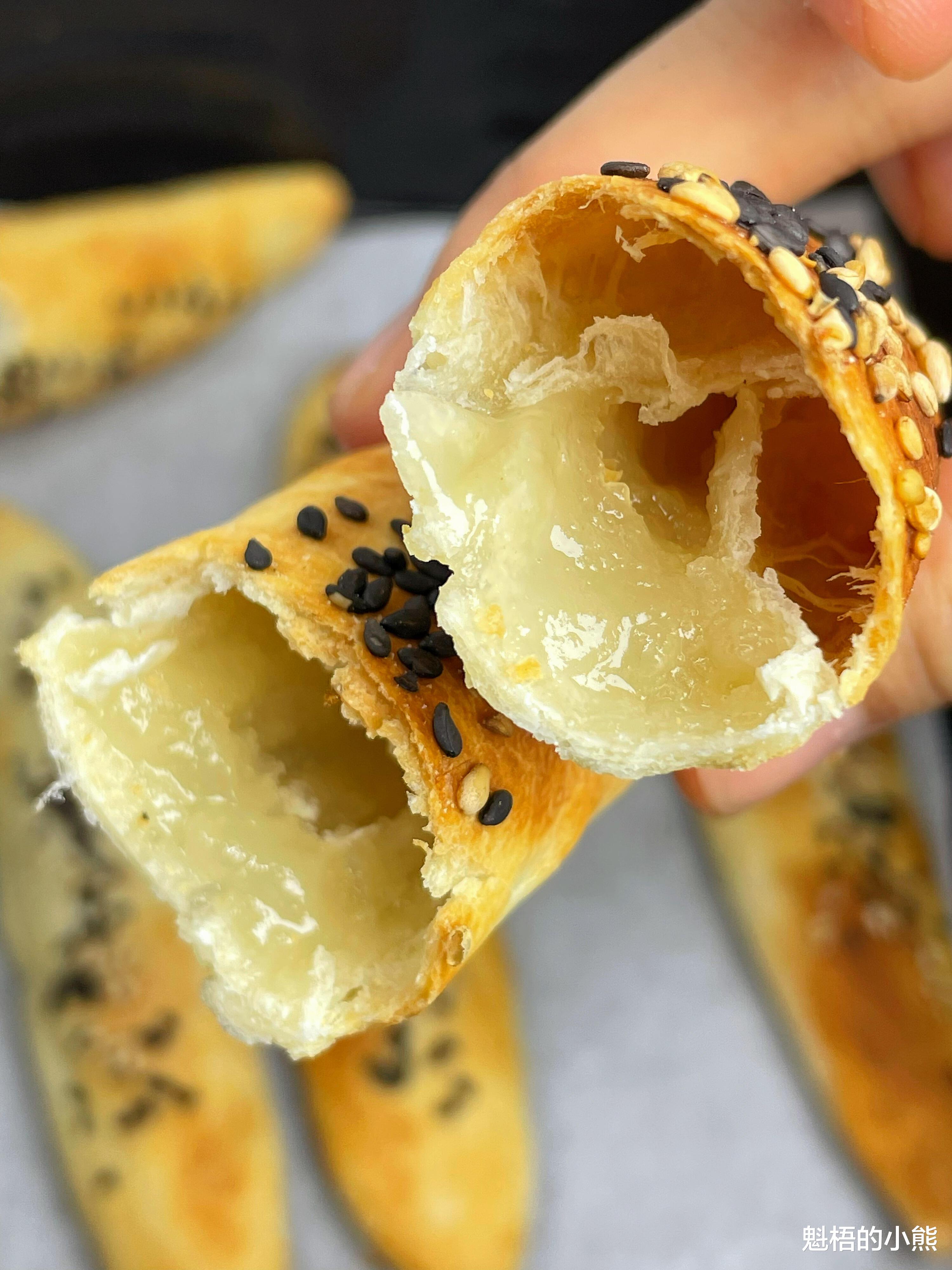 稍微晾凉,拿一个咬一口,咔嚓一声,酥脆得掉渣,里面是空心的,糖馅已经融化,甜丝丝的,带着芝麻的焦香。饼皮薄如纸,又香又脆,比外面卖的烧饼还好吃。配杯牛奶,就是完美的早餐;下午嘴馋了,烤几个当零食,比薯片健康多了。