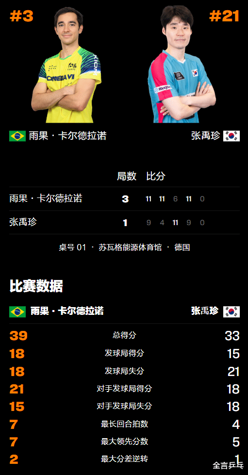 第三局雨果遭到张禹珍的反击而落后比分,中间段将对手打退台后遭到反击而出现失误,很快便4-9落后于人,紧接着6-10被对方拿到4个局点,随后被张禹珍的进攻擦网打乱阵脚,最终以6-11告负无缘速战速决。
