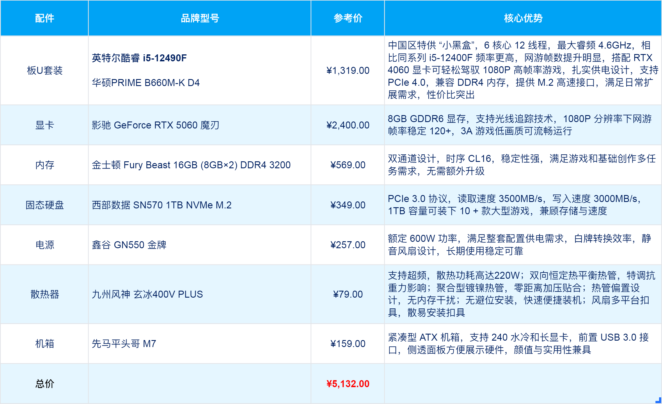 适合刚接触 PC 游戏的入门玩家,能流畅运行《英雄联盟》《腾讯全家桶》等网游,同时满足 1080P 低画质 3A 游戏(如《赛博朋克 2077》)和基础平面设计需求,预算可控且性能无短板。