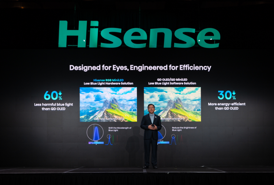 更令人惊喜的是,光源与光色同控芯片的双重进化,让海信RGB-Mini LED电视的有害蓝光比QD-OLED降低60%,比传统QD-Mini LED降低75%,能耗同步降低30%!在拥有极致画质的同时,既是守护双眼的护眼先锋,更是引领行业的节能标杆,贴心又环保!