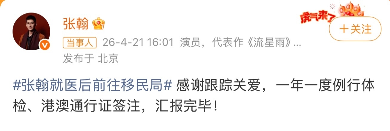 对此,张翰通过个人社交平台作出回应,表示此次行程系"一年一度例行体检"及"港澳通行证签注",并感谢外界关心。