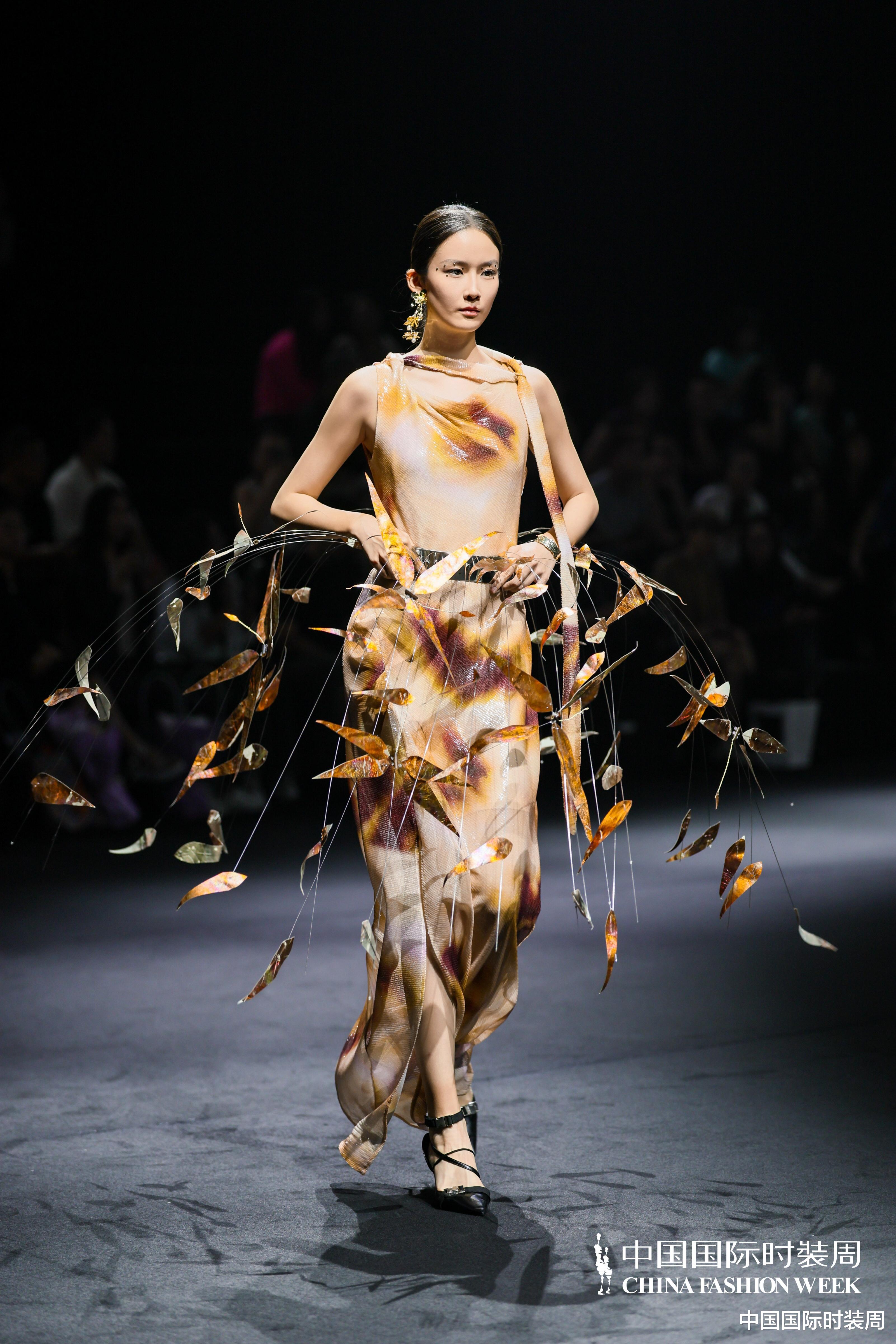 “君子爱竹”—— 黄斯赟对中国诗画中的重要文化符号“竹”的形态、色彩、材质与空间组织进行了精心编排与创新再造:对传统竹衣进行解构重组,将竹管编织成当代时髦的“竹衣”单品;将紫竹制成轻盈灵动的“竹蜻蜓“;将传统非遗“烧箔”工艺创新性地应用于印有竹子图形的真丝绡织物,呈现斑斓色彩与烁金闪耀的肌理质感,轻柔唯美却不失厚重,大面积与局部点缀形成强烈对比,处处将“虚实”哲思转译为视觉语汇,体现了工艺之美与先锋观念的双重交融。