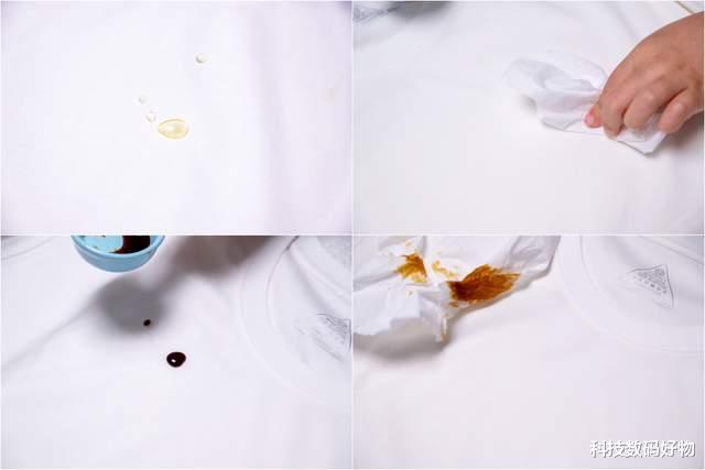 深色含糖饮料是浅色衣物的天敌。测试中,可乐倾泻于衣面,同样凝珠成型,未晕染、未渗透。纸巾轻按即净,无湿痕、无残留色渍。这一特性在日常场景中颇具实用价值:咖啡渍、酱汁溅落的风险大幅降低,"小心翼翼端着杯子"的紧张感得以缓解。更关键的是,多次洗涤后的复测验证了耐久性,解决了此前购买同类产品的痛点——"新衣有效、旧衣失效"的落差。